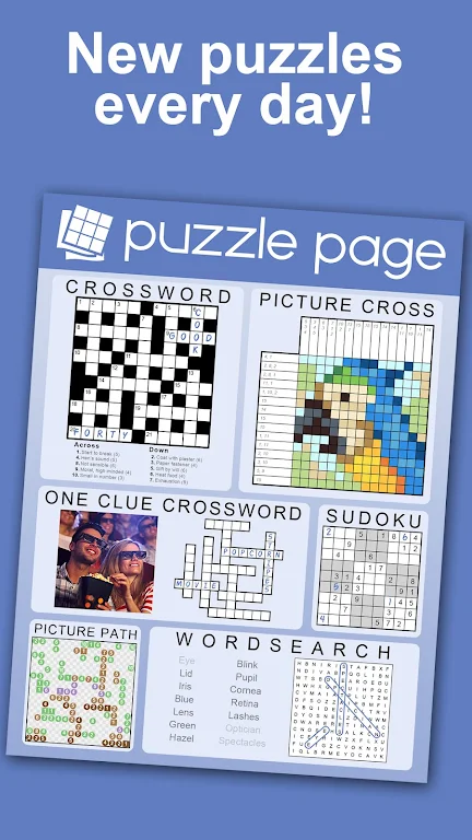 Keep your mind active with a new page of your favorite puzzles delivered free to your device every day!Each day there's a new assortment of word, picture, number and logic puzzles to complete.