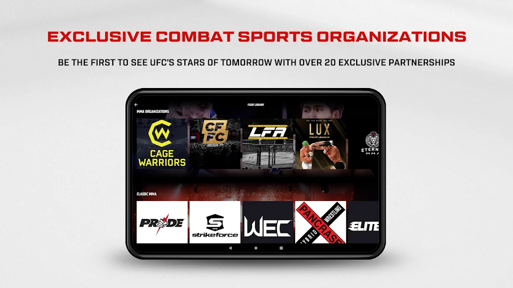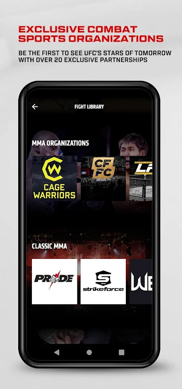 - Umfangreiche Kampfbibliothek: Erleben Sie klassische Kämpfe noch einmal und informieren Sie sich über vergangene UFC-Events, einschließlich vollständiger Kampfkarten, einzelner Kämpfe und exklusiver Inhalte hinter den Kulissen. Außerdem ein historisches Archiv von Nicht-UFC-Events von PRIDE, Strikeforce, WEC und über 50 anderen Kampfsportorganisationen.