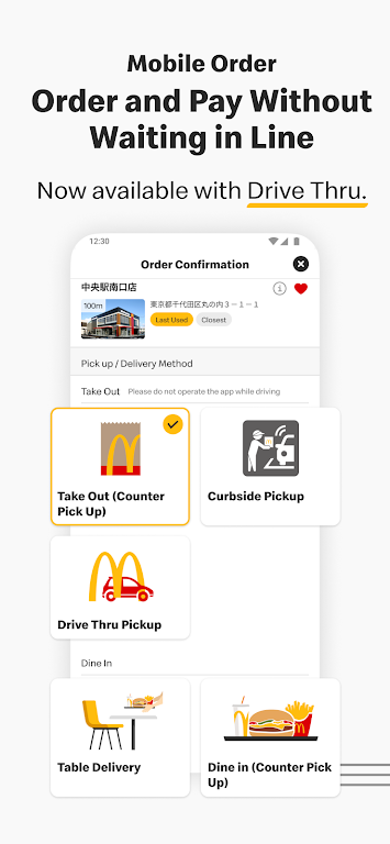 テーブルにスタッフがお届け(テーブルサービス)、カウンターで受け取る、テイクアウト、パーク&ゴー、ドライブスルー のいずれかをお選びください。