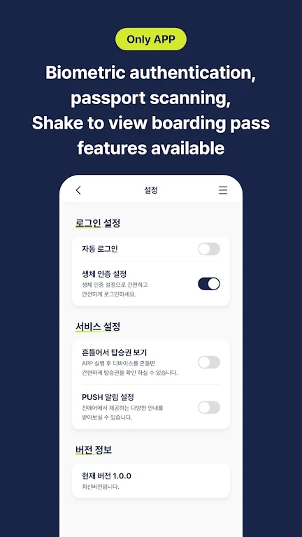- 생체 인증 여권스캔, 흔들어 탑승권 보기 기능 지원