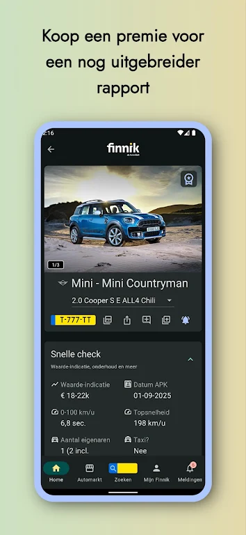Download de gratis app, vul een Nederlands kenteken in en bekijk snel alle autogegevens over jouw favoriete automerk: Tesla, BMW, Volvo, Mercedes, Volkswagen, Renault, Toyota, Opel en nog veel meer! De kentekencheck van Finnik is handig voor als je een auto wil kopen of verkopen, maar ook ideaal voor autospotters.