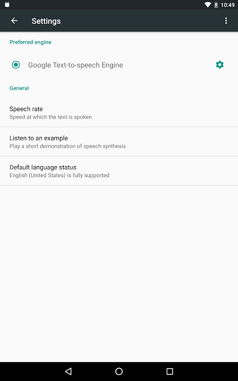 To use Google Text-to-Speech functionality on your Android device, go to Settings > Languages & Input > Text-to-Speech output. Select Speech Recognition and Synthesis from Google as your preferred engine.