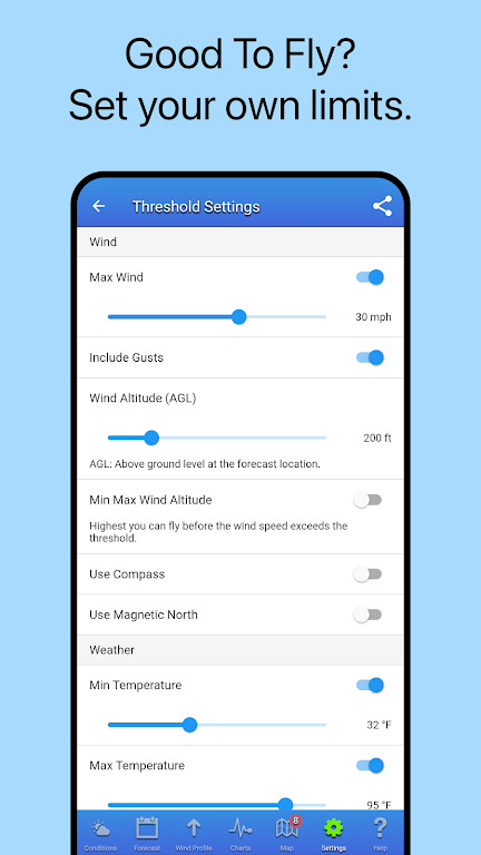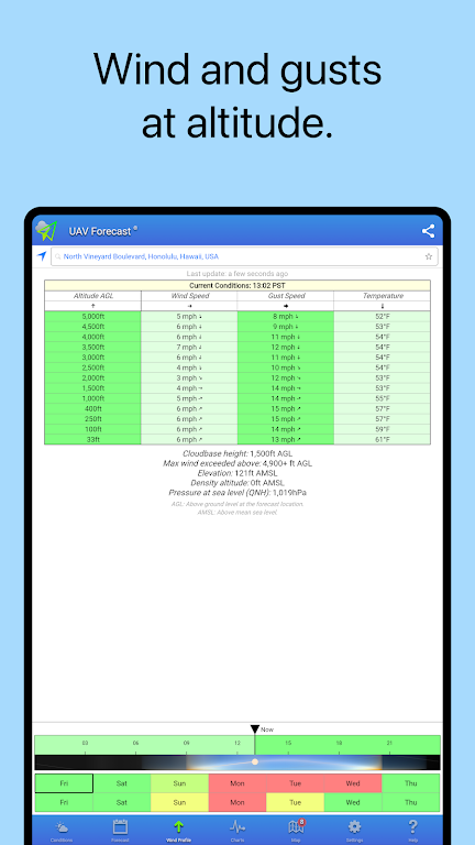 • ข้อมูลสภาพอากาศในท้องถิ่นอย่างละเอียด รวมถึงความเร็วลมและความเร็วลมกระโชกที่ระดับพื้นดินและที่ความสูงใดๆ