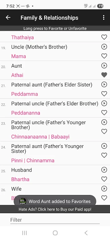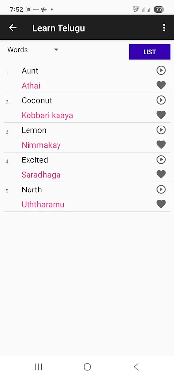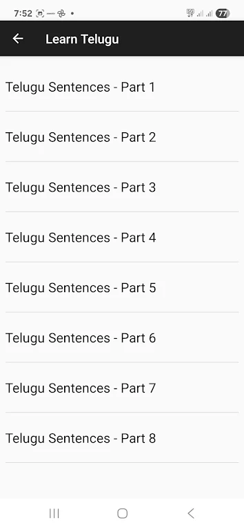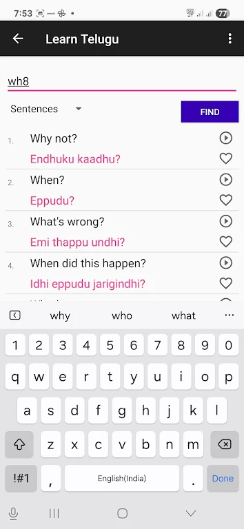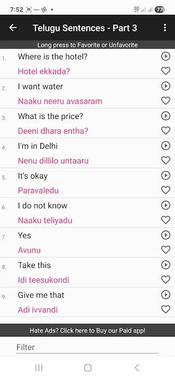 Bạn muốn tự tin nói tiếng Telugu mà không cần học chữ viết? Ứng dụng này được thiết kế để giúp bạn học tiếng Telugu giao tiếp thông qua tiếng Anh, sử dụng các từ vựng đơn giản và thiết thực hàng ngày.Ứng dụng bao gồm hơn 350 câu tiếng Telugu thông dụng và hơn 350 từ vựng thiết yếu, tất cả đều có phát âm rõ ràng. Cho dù bạn đang đi du lịch, nói chuyện với bạn bè Telugu hay chỉ đơn giản là muốn học một ngôn ngữ mới, ứng dụng này là một điểm khởi đầu hoàn hảo.