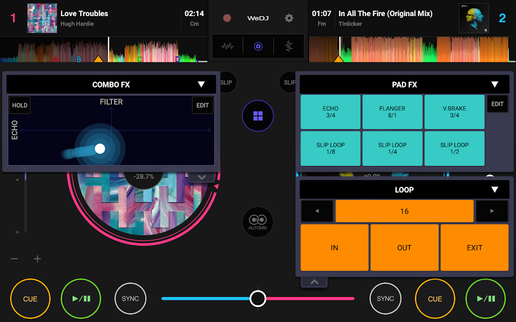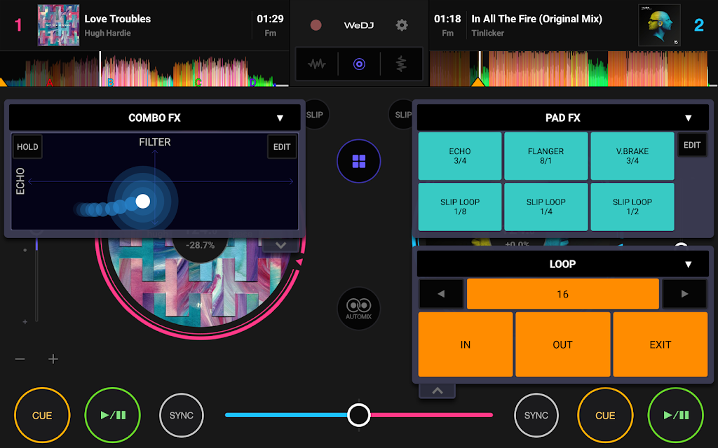 - Các tính năng hiệu suất: Hot Cues, vòng lặp, bộ lấy mẫu, Pad FX và Combo FX chỉ là một số tính năng nâng cao của WeDJ. Giải phóng khả năng sáng tạo của bạn – mà không cần chuyển bảng hiệu suất.